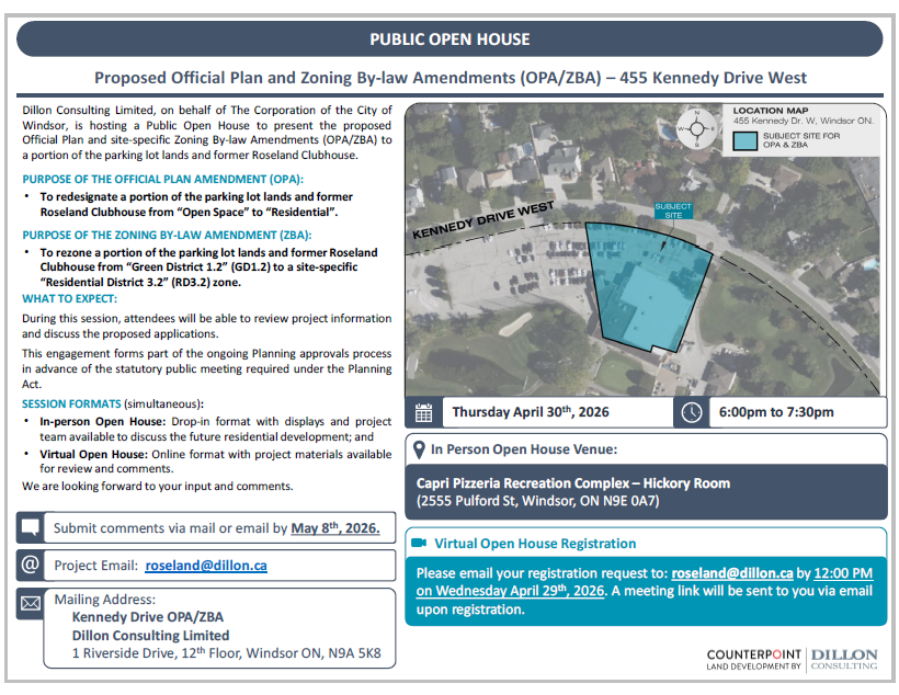 The City of Windsor is launching the Expression of Interest (EOI) and Prequalification (No. 118-25) on Friday, October 3, 2025, for the construction of the Roseland Clubhouse and residential development within the parking lot. This approach allows the City to identify qualified developers early and gather innovative proposals before entering into a formal Request for Proposals (RFP). This marks the third property to be made available under the City’s Housing Solutions Made for Windsor strategy, an initiative focused on increasing housing supply by preparing municipal lands for residential development.